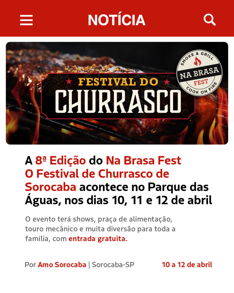 NA BRASA FEST – O FESTIVAL DE CHURRASCO DE SOROCABA, acontece no dias 10, 11 e 12 de Abril, no PARQUE DAS ÁGUAS com entrada gratuita ✔️